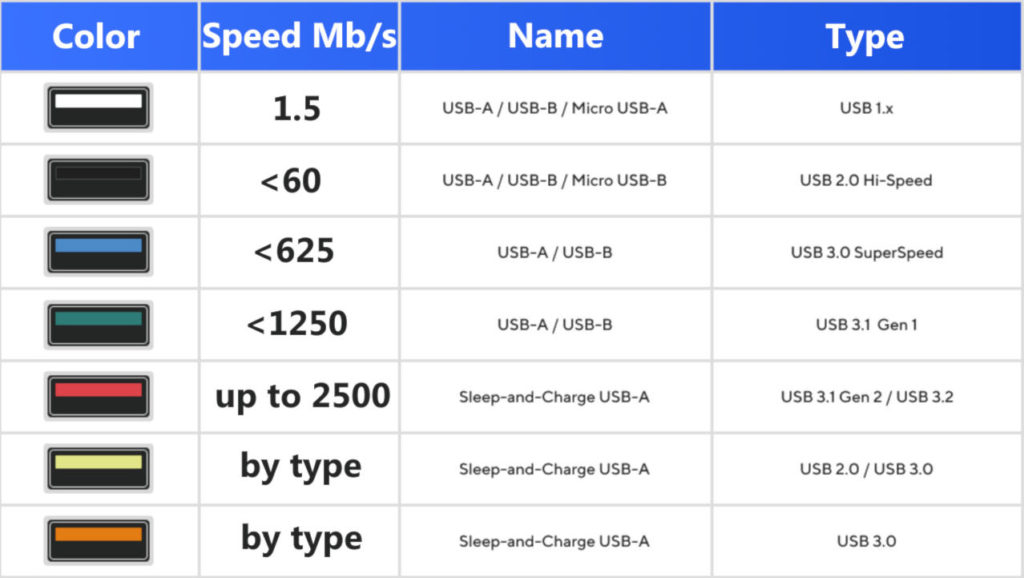 USB 1.0 is long outdated, while USB 2.0 was released in such huge numbers that it still makes up the majority of ports today. Inside each connector, there’s a plastic insert, and it can come in different colors.