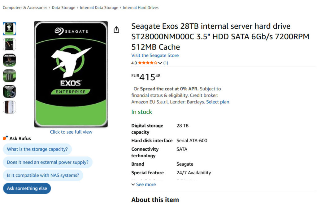 Assuming HDDs don’t experience the same price surge as RAM recently did, the Seagate Exos 55TB will likely cost around €700++.