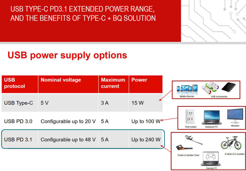 The new USB-PD 3.1 Extended Power Range (EPR) can raise that to 48 V, delivering as much as 240 W.