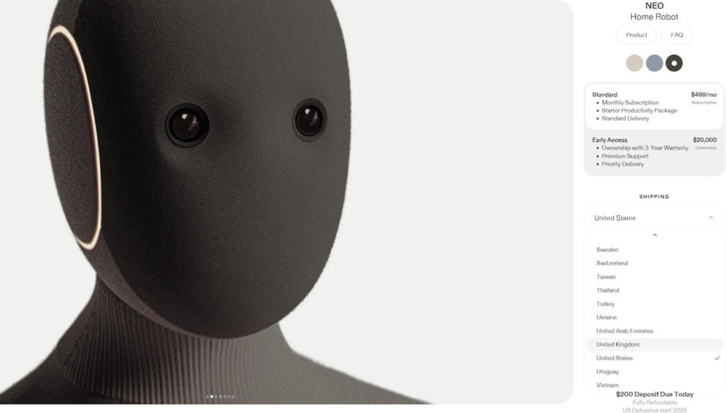The answer to the last question is: you can buy the NEO robot today and have it delivered anywhere in the world — even Nepal, Pakistan, or Nicaragua — just not Russia.